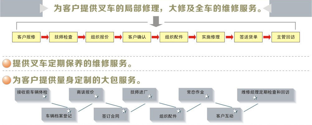 "精益求精"是我司服務(wù)客戶的主要信念。我司擁有600多名訓(xùn)練有素的維修工程師,維修服務(wù)團隊強大。目前,我司還擁有160多名各類高級維修工程師,可全方位的為客戶提供日系,歐美系內(nèi)燃叉車、、電瓶叉車的維修服務(wù)及故障解決方案。公司定期在國內(nèi)舉辦技術(shù)研修課程,以確保維修服務(wù)人員得到最新的產(chǎn)品知識和技能學(xué)習(xí)。